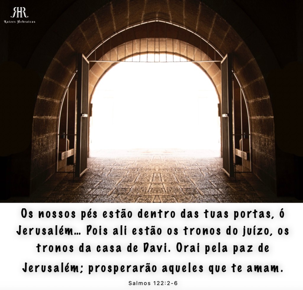 Os nossos pés estão dentro das tuas portas, ó Jerusalém… Pois ali estão os tronos do juízo, os tronos da casa de Davi. Orai pela paz de Jerusalém; prosperarão aqueles que te amam.